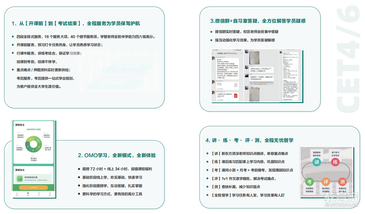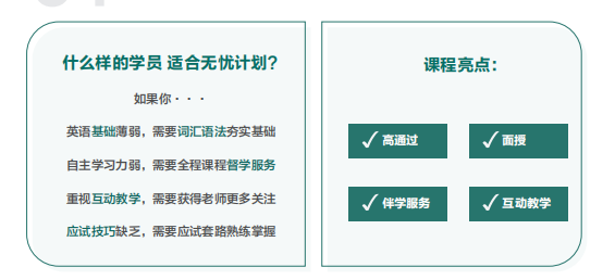 涵盖基础词汇、语法、阅读、听力、写作、翻译等各个板块的教学课程进行一对一针对性教学,通过为学生定制个性化备考方案,针对性补弱培优,提升考生的综合能力